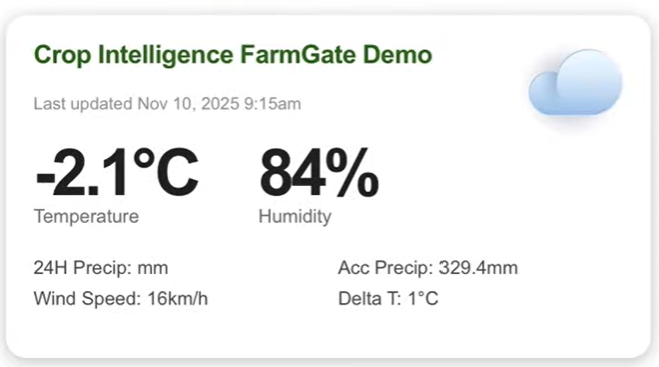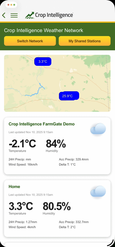 The Crop Intelligence Vendor Weather Network connects growers through sahred, high-quality environmental data, empowering smarter decisions, stronger farm communities and better yields. Users gain richer, more accurate weather insights across their fields, all while maintaining full control over what they share.
